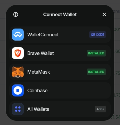 Pick your wallet from the list. If you are visiting the website from a different device, e.g. on your laptop, while the wallet is on your phone, most wallets allow you to connect using a QR code. For this select WalletConnect.