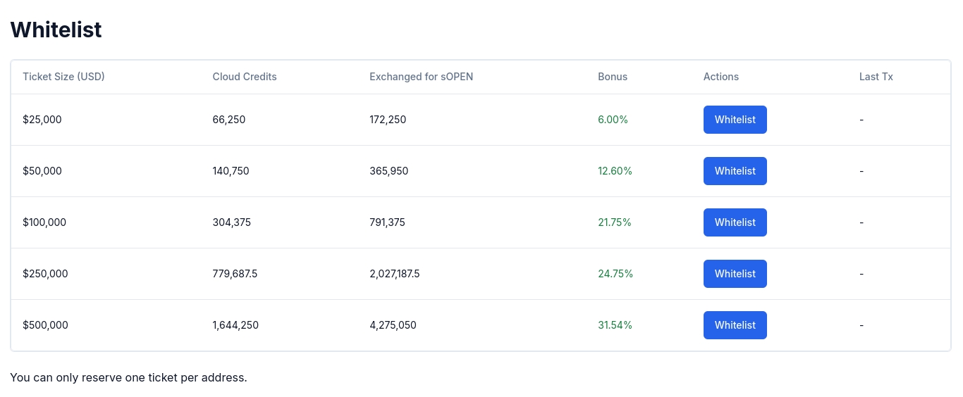 You can only whitelist one ticket. Higher ticket size contributions have a higher bonus rate, earning you more Cloud Credits. Cloud Credits can be exchanged for a variety of Openmesh products, including XnodeOne and sOPEN. XnodeOne is an NFT that grants ownership to a server for 12 months, which you can use however you like, with the monthly fee paid by Openmesh. sOPEN is our early access ERC20 token on Ethereum, which can be redeemed 1 to 1 for OPEN after its Token Generation Event (TGE). OPEN is a governance token that grants voting rights in the Openmesh DAO. OPEN token holders will vote on the future of Openmesh, completely powered by smart contracts, allowing for transparent, trustless, and secure governance.