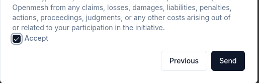 Thank you for participating. Your ticket should now show up underneath the whitelist table, but this can take a few minutes. Please contact <samuel.mens@openmesh.network> in case you run into any issues.