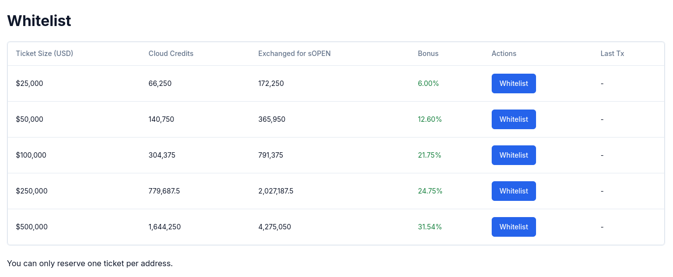 You can only whitelist one ticket. Higher ticket size contributions have a higher bonus rate, earning you more Cloud Credits. Cloud Credits can be exchanged for a variety of Openmesh products, including XnodeOne and sOPEN. XnodeOne is an NFT that grants ownership to a server for 12 months, which you can use however you like, with the monthly fee paid by Openmesh. sOPEN is our early access ERC20 token on Ethereum, which can be redeemed 1 to 1 for OPEN after its Token Generation Event (TGE). OPEN is a governance token that grants voting rights in the Openmesh DAO. OPEN token holders will vote on the future of Openmesh, completely powered by smart contracts, allowing for transparent, trustless, and secure governance.&#x20;