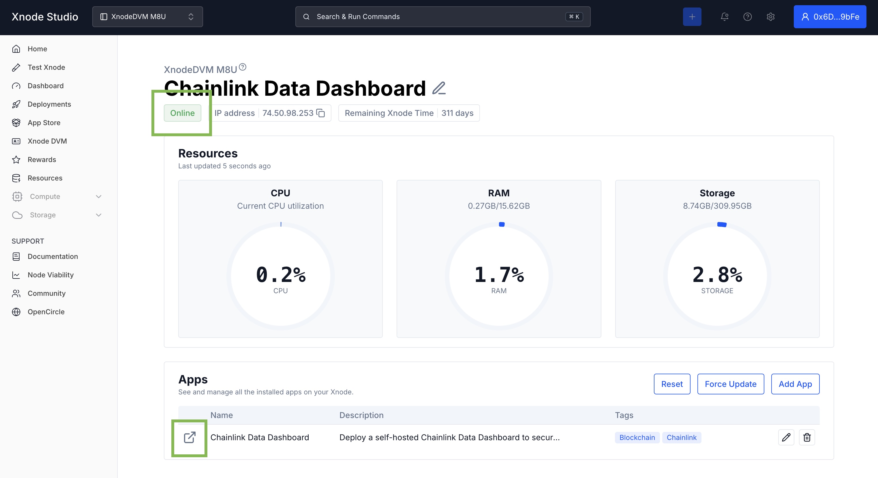 On the Dashboard you can see your deployed bare metal server along with all the Apps installed on it. As we have only just created the DVM, it has our Chainlink Data Dashboard.