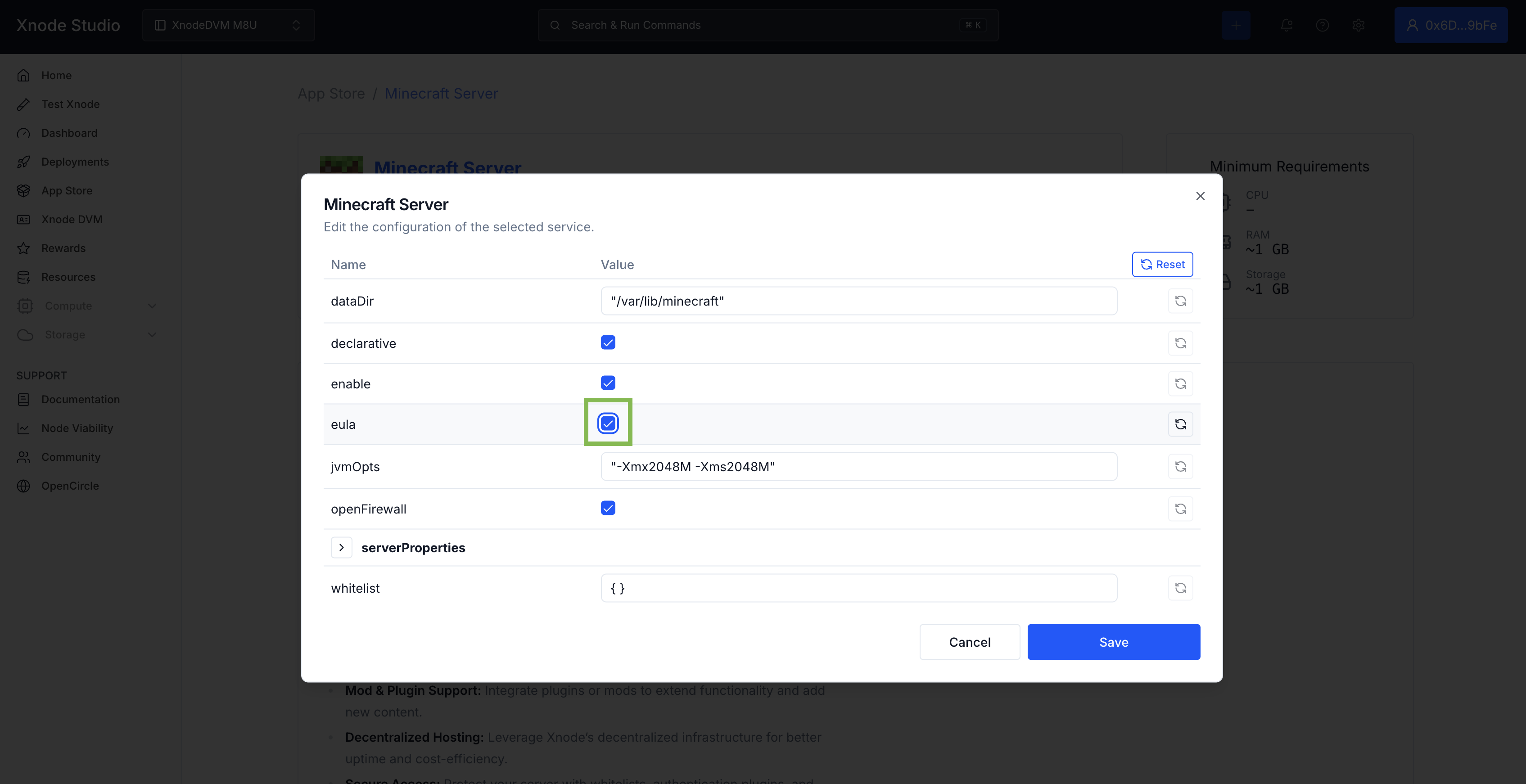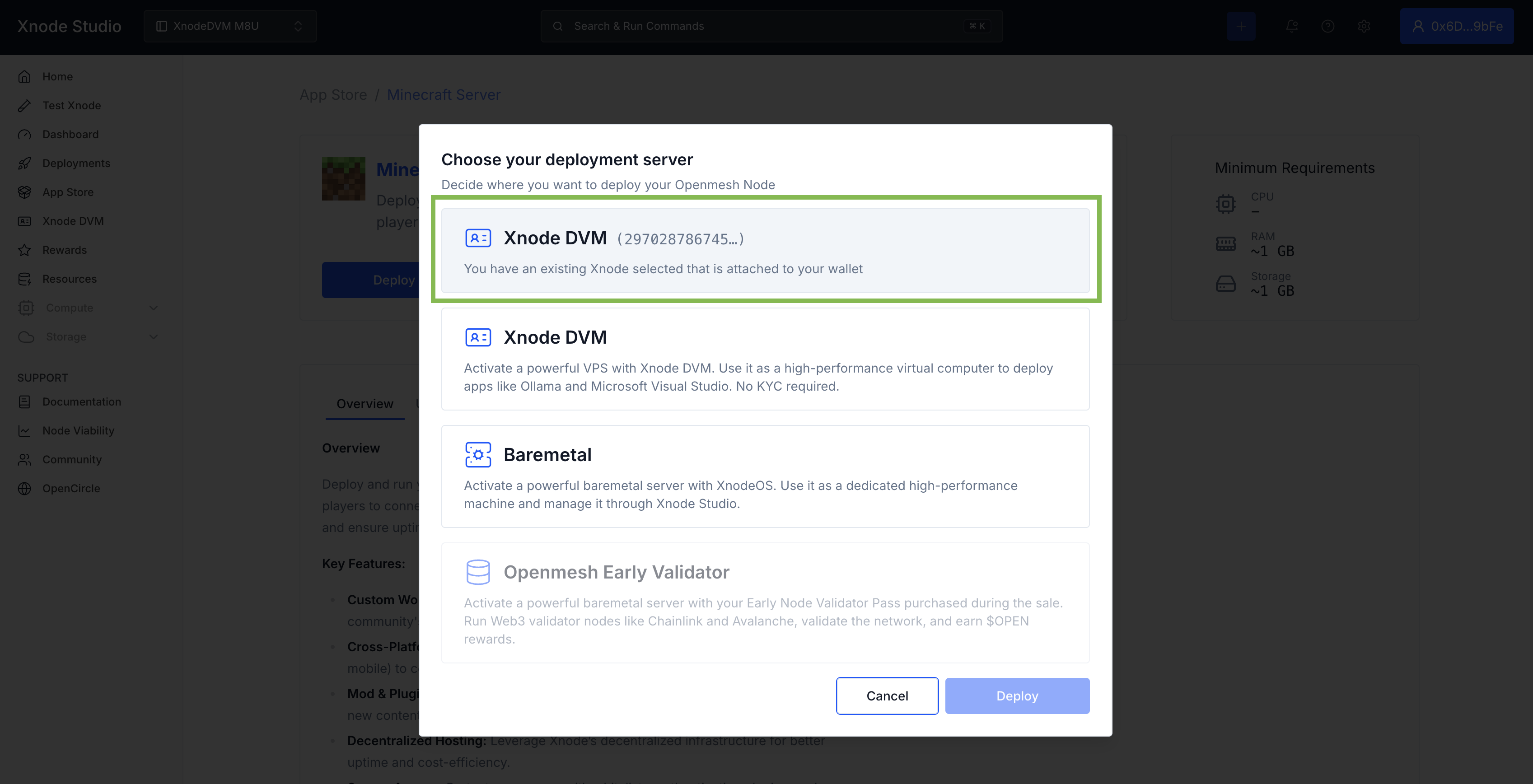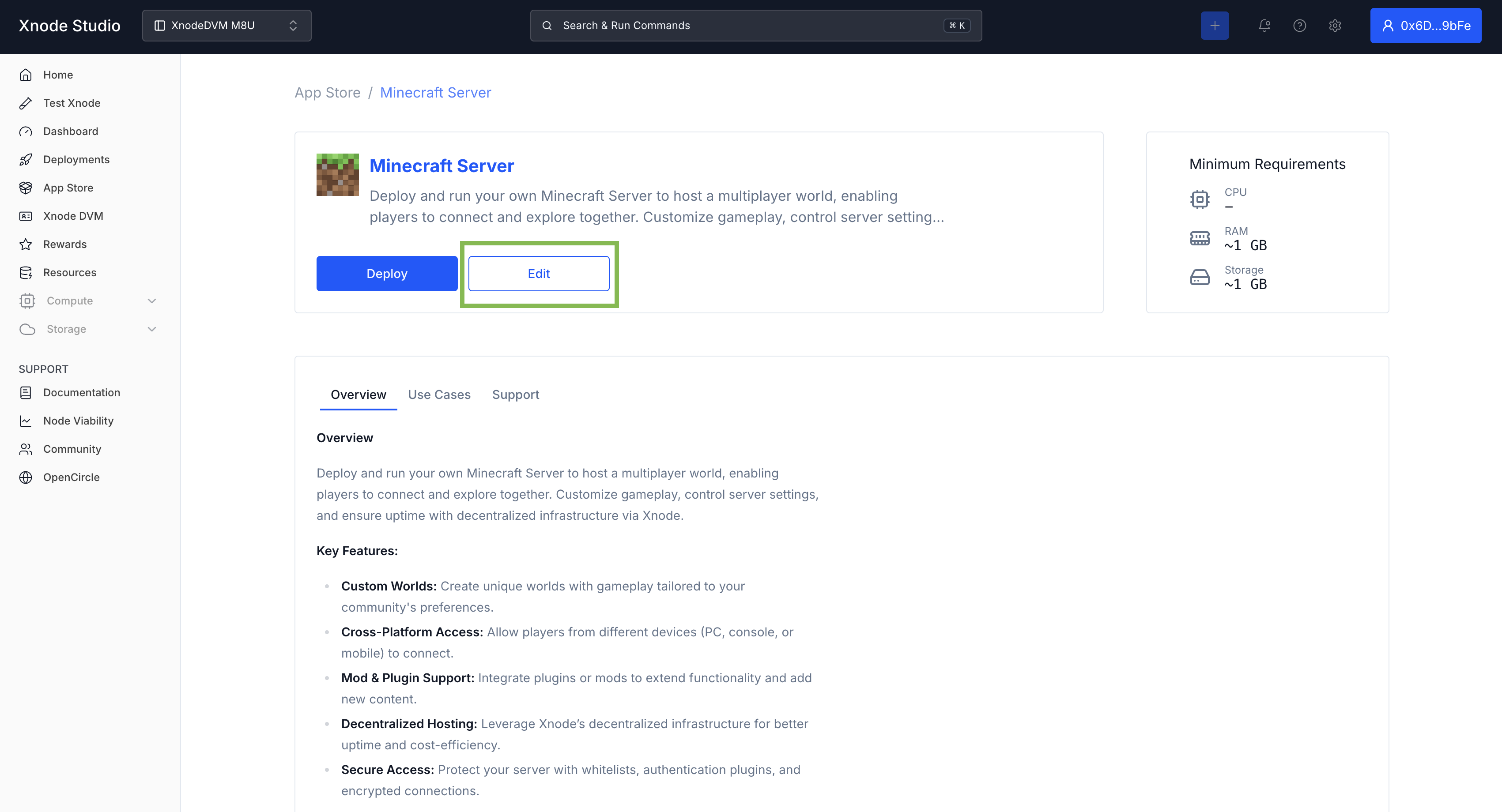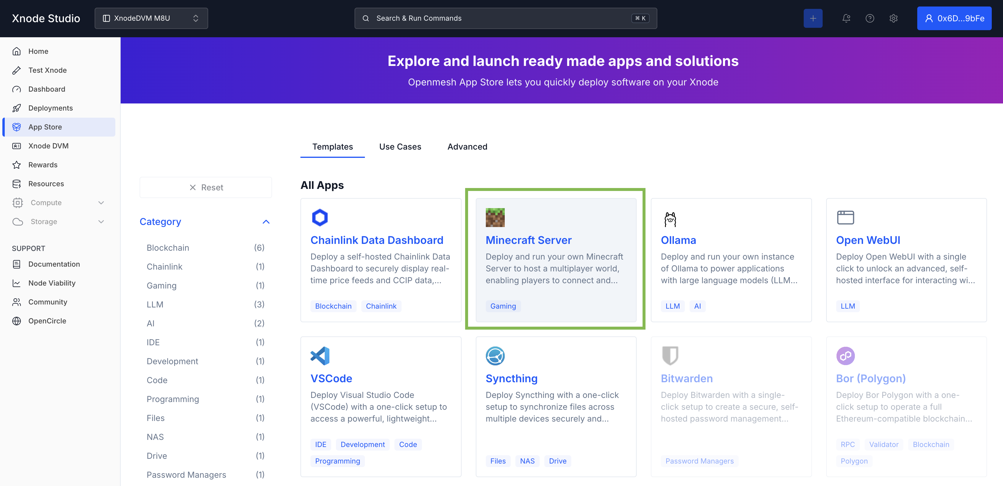 Then visit the [App Store](https://www.openmesh.network/xnode/app-store) from within your Xnode Studio dashboard and select Minecraft app template.