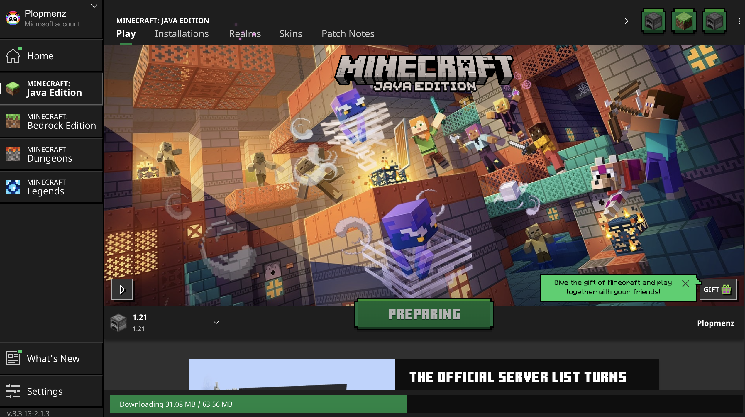 Once Minecraft is installed it will automatically download any updates needed for the client. Currently our App Template for Minecraft supports version 1.21 so you must ensure your client is also running Minecraft 1.21 otherwise you will receive a version error. After selecting the version select the Play button.